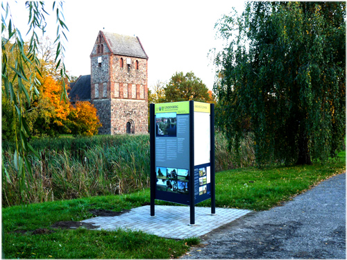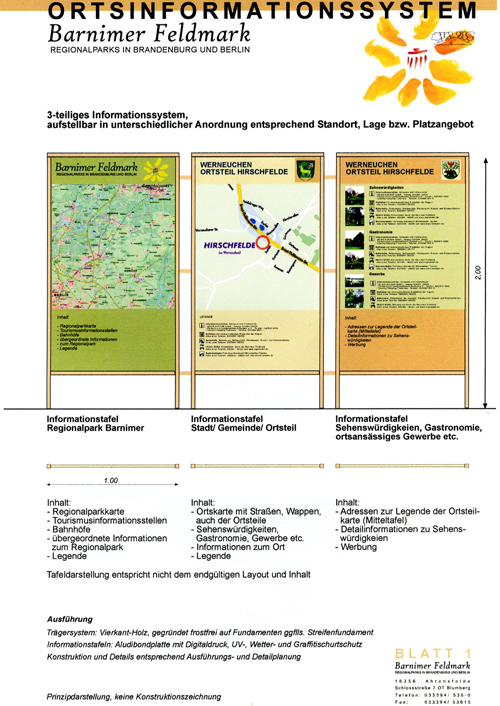 Konzept, Formgebung und Inhaltliche Gestaltung von Ostsinformationstafeln mit gleichem Aussehen in 10 Gemeinden der Bereiche Ahrensfelde und Werneuchen sowie Bernau. Auf dem von mir entwickelten dreiteiligen Informationssystem werden die Regionalparkkarte, eine Ortsteilkarte und, gemeinsam mit den Gemeinden erarbeitete Touristinformationen dargestellt und gastronomische Einrichtungen sowie einheimisches Gewerbe beworben.